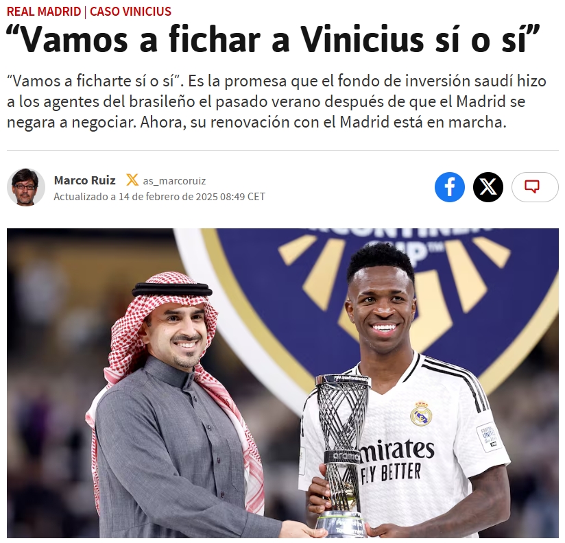 02月14日訊 維尼修斯與沙特聯(lián)賽的轉會傳聞愈演愈烈,《阿斯》透露了新的消息。