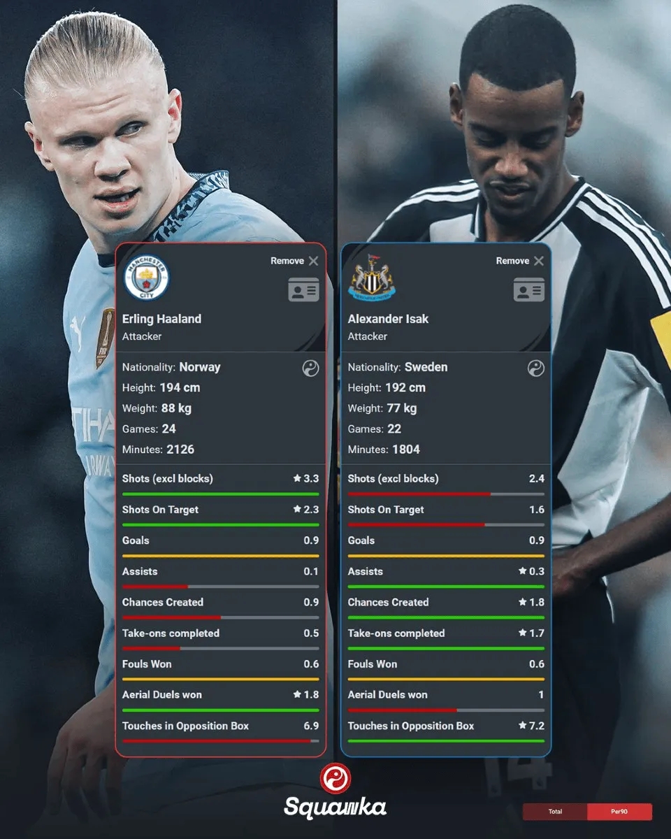 2月15日訊 本周英超第25輪,曼城主場(chǎng)對(duì)陣紐卡。Squawka對(duì)比了哈蘭德和伊薩克本賽季英超的數(shù)據(jù)。