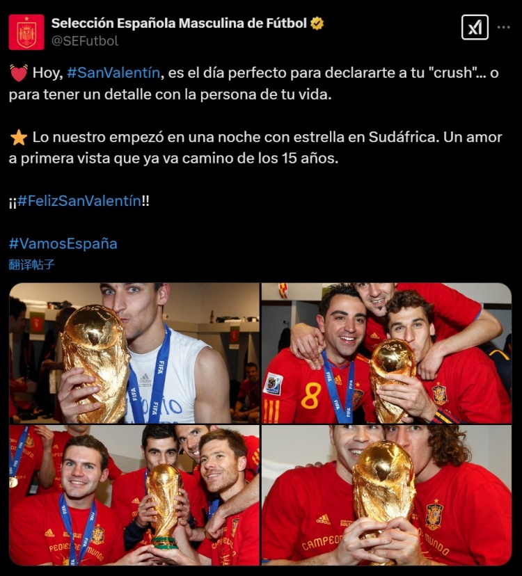 西班牙隊官推曬出了球隊贏得2010年世界杯后的照片,并配文:“今天是情人節(jié),是向你暗戀的人表白愛情的完美日子。你也可以向你生命中重要的人表達(dá)愛意。??而我們之間的愛情則始于南非的一個星光燦爛的夜晚。我們一見鐘情,至今已過去15年了。”