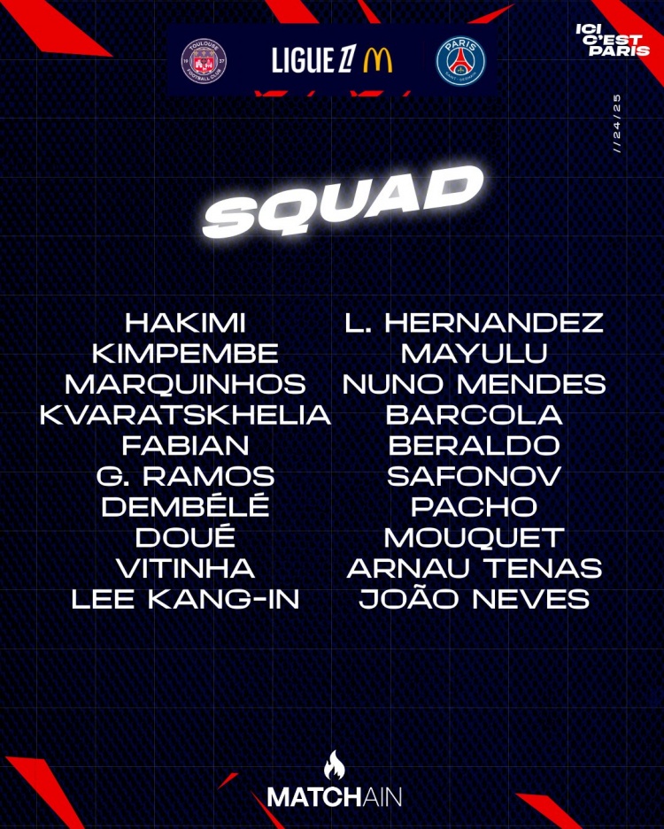 中場:法比安-魯伊斯、維蒂尼亞、李剛仁、馬尤盧、若昂-內維斯