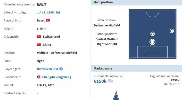 楊明洋,1995年7月11日出生于瑞士巴塞爾,2021年回歸中國籍,司職防守型中場(chǎng)。2024賽季,楊明洋代表南通支云出戰(zhàn)24場(chǎng),貢獻(xiàn)了2次助攻。