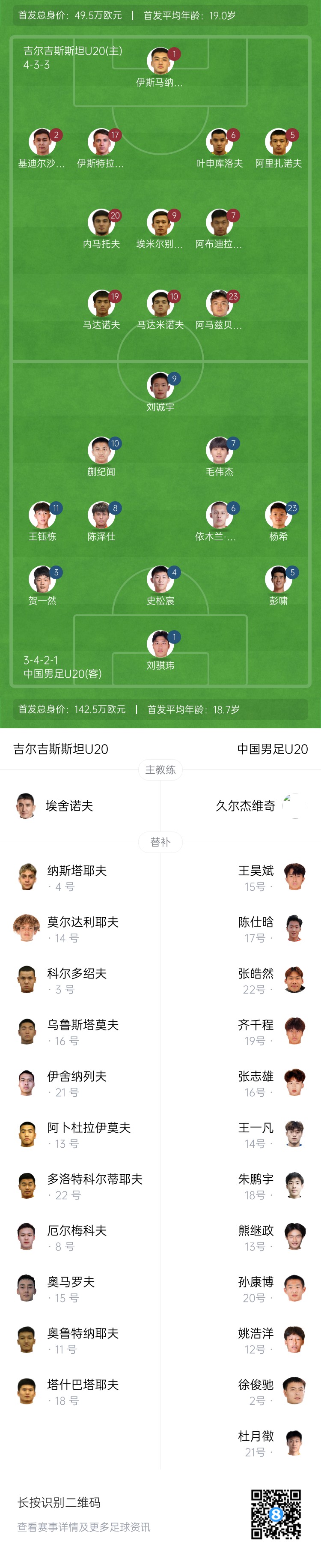 U20國足首發(fā):1-劉騏瑋、3-賀一然、4-史松宸、5-彭嘯、23-楊希、6-依木蘭-買買提、7-毛偉杰、8-陳澤仕、10-蒯紀(jì)聞、11-王鈺棟、9-劉誠宇