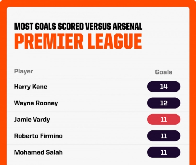 據(jù)Opta統(tǒng)計(jì),萊斯特城前鋒瓦爾迪英超對(duì)陣阿森納打進(jìn)11球,槍手是被他破門最多的球隊(duì),賽事歷史上僅少于凱恩和魯尼。