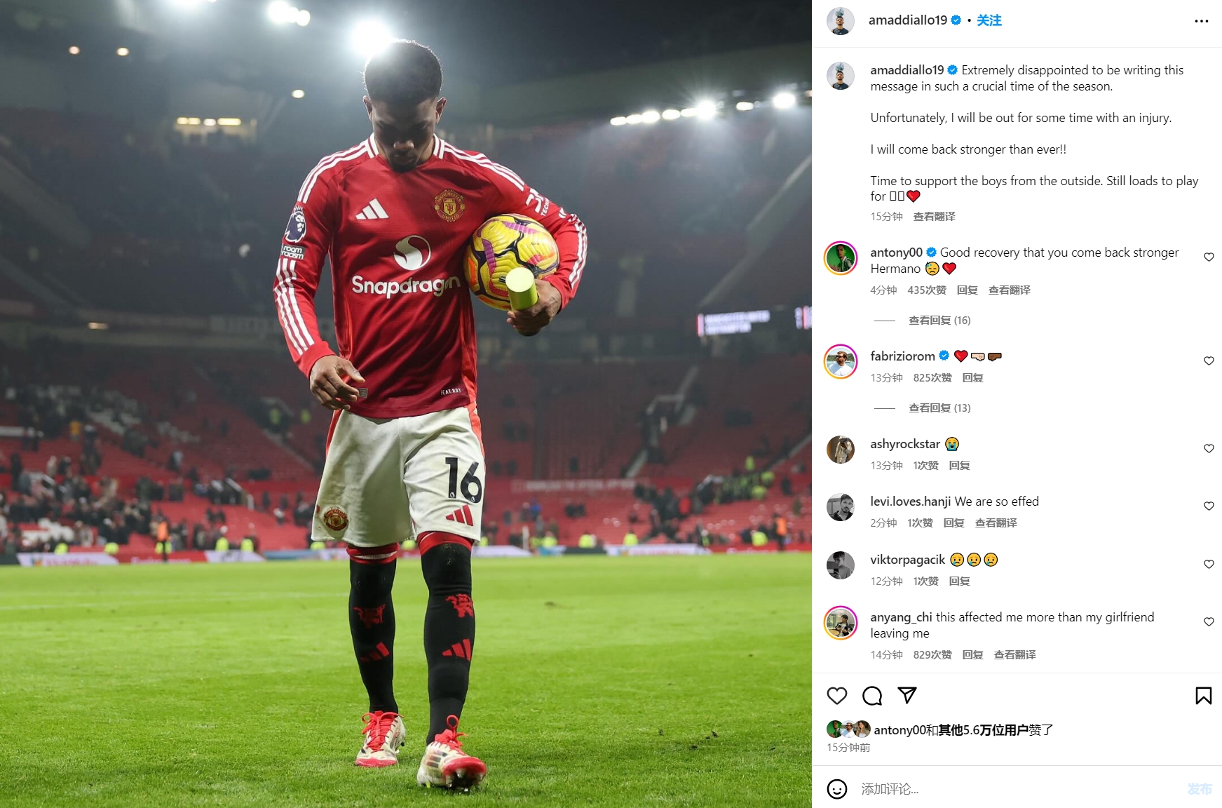 曼聯(lián)外租球員安東尼也安慰阿瑪?shù)拢盒值?,祝你康?fù)過程一切順利,希望復(fù)出時你能更加強(qiáng)大。