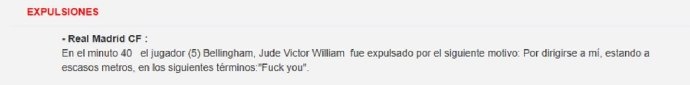 在賽后裁判報告中,談及貝林厄姆被紅牌罰下的原因:他在距離我僅數(shù)米遠的地方,對我說了“Fxxk you”。
