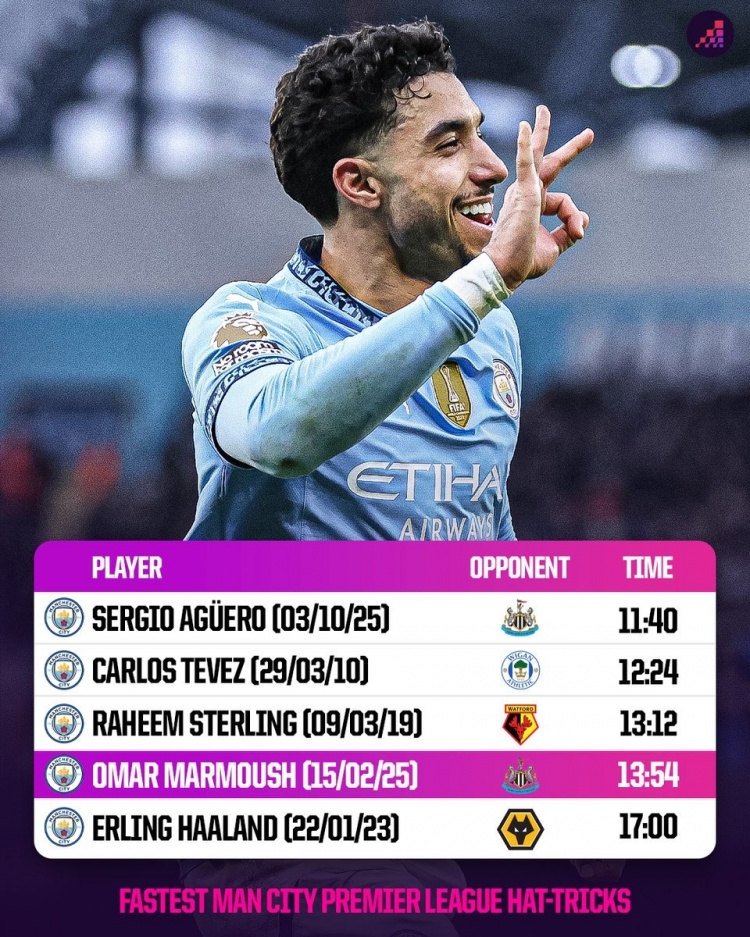 2月16日訊 曼城在本輪英超3-0領先紐卡,馬爾穆什上半場戴帽,數(shù)據(jù)統(tǒng)計顯示他3粒進球間隔僅13分54秒。