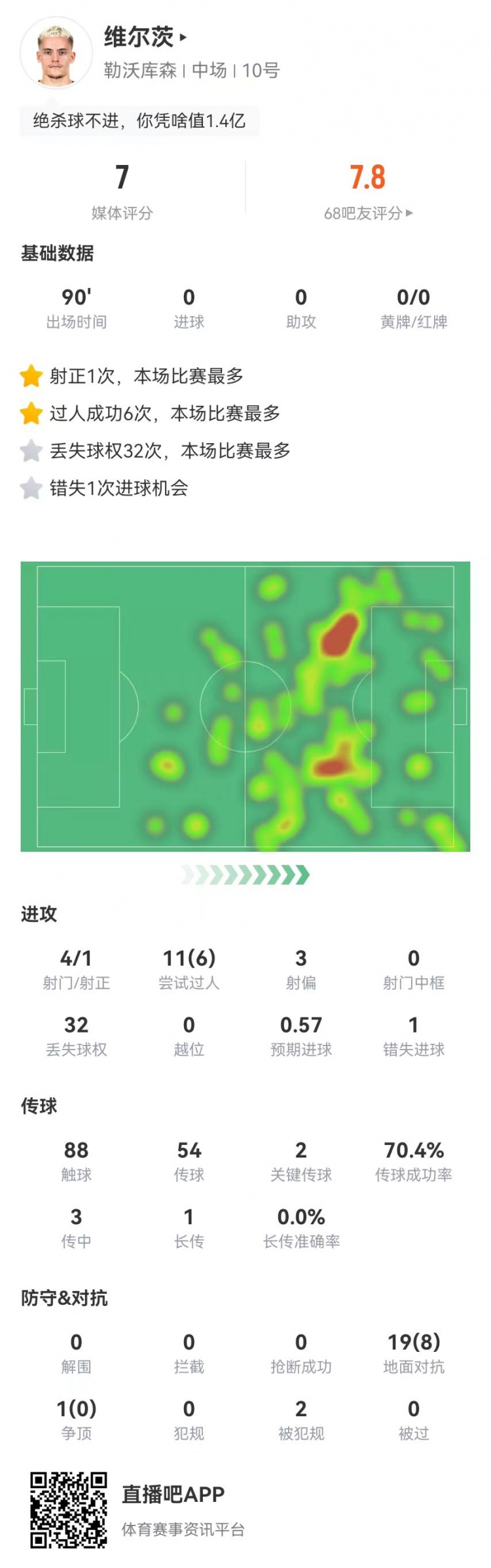 2月16日訊 勒沃庫(kù)森在本輪德甲0-0遭拜仁逼平,維爾茨本場(chǎng)數(shù)據(jù)如下: