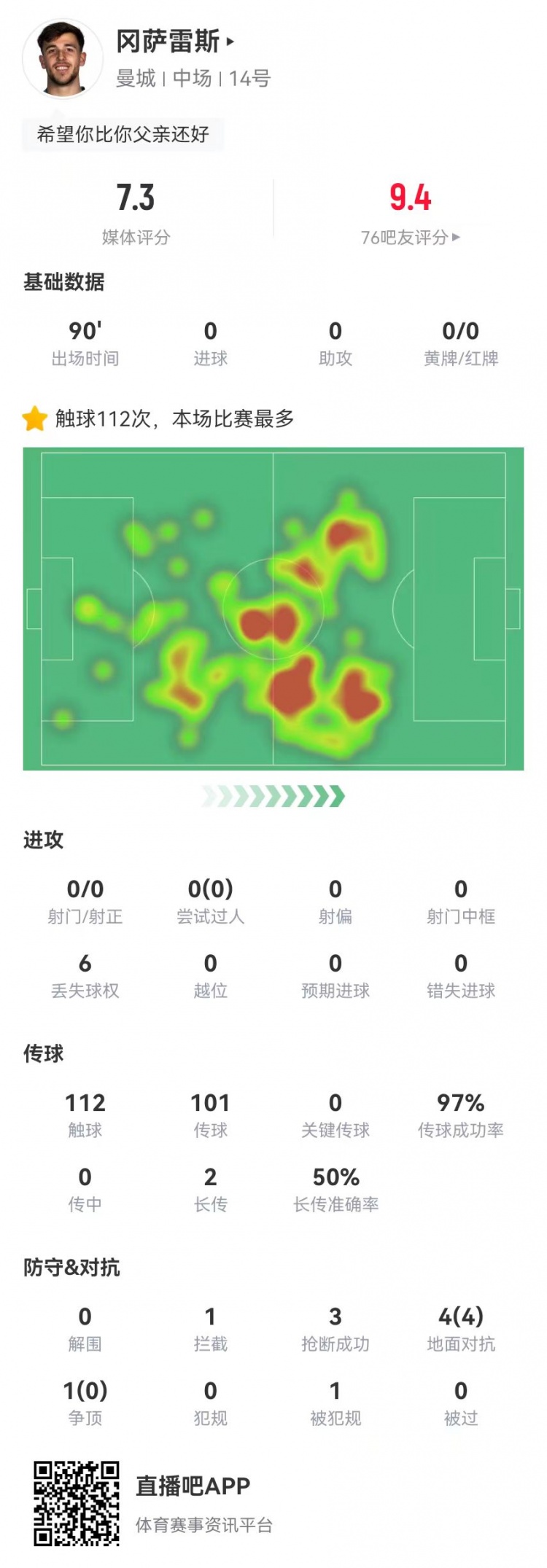 岡薩雷斯本場比賽觸球達到112次,是全場最多的球員。他的傳球成功率也有97%,同樣是全場最高。在防守端他也有著1攔截3搶斷和4次對抗全成功的戰(zhàn)績,僅有爭頂失敗一次。