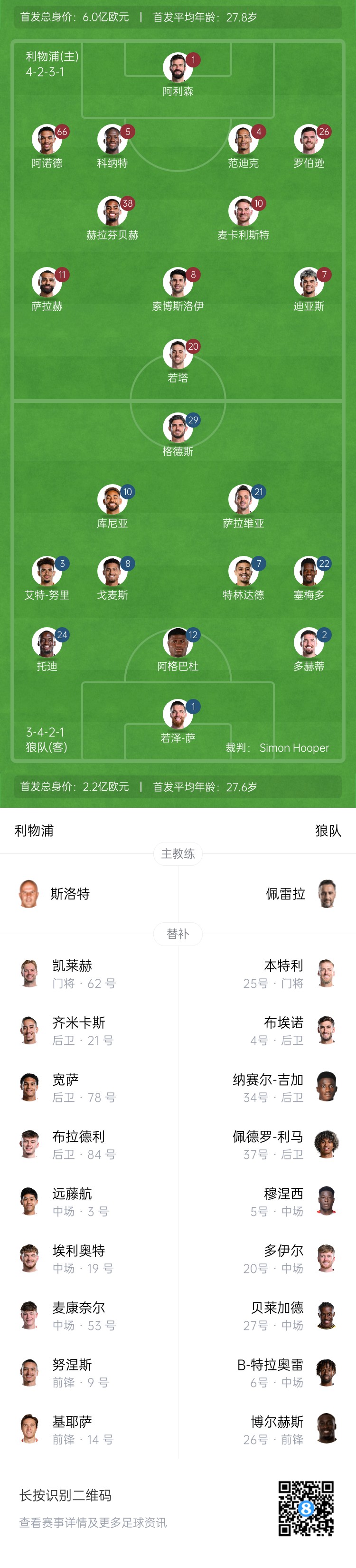 利物浦首發(fā):1-阿利森、4-范迪克、5-科納特、26-羅伯遜、66-阿諾德、8-索博斯洛伊、10-麥卡利斯特、38-赫拉芬貝赫、7-路易斯-迪亞斯、11-薩拉赫、20-若塔