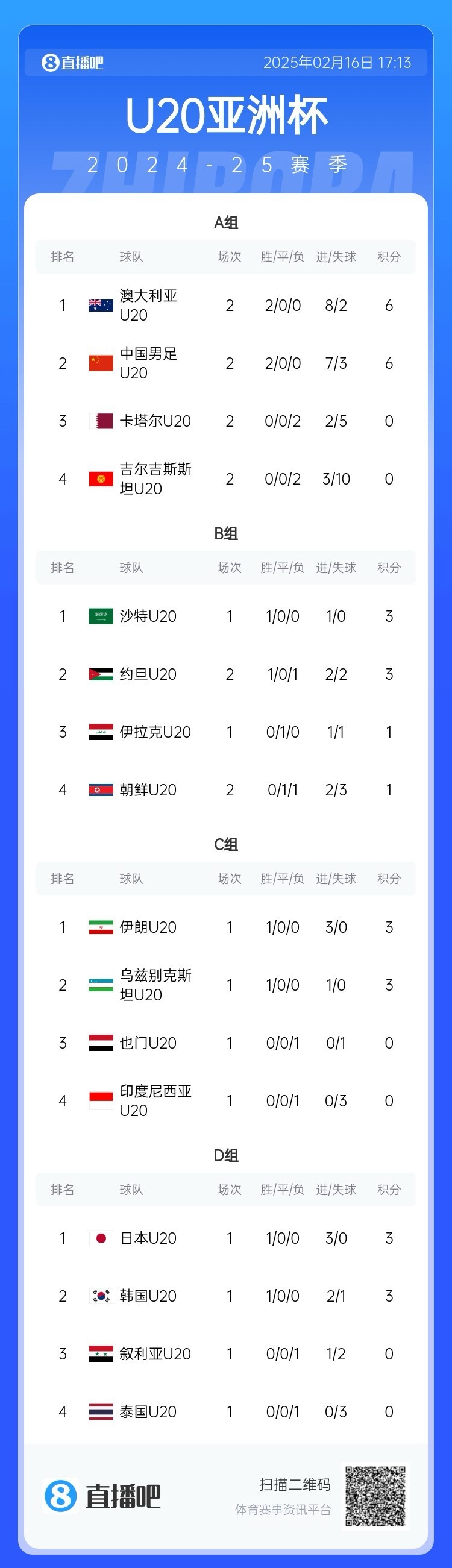 2月16日訊 北京時(shí)間今天下午進(jìn)行的U20亞洲杯B組第二輪比賽,朝鮮1-2不敵約旦,兩輪過后僅積1分。