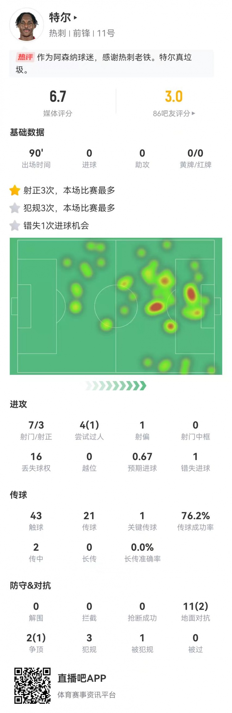 特爾英超首秀數(shù)據(jù):7射3正+1失良機(jī) 1關(guān)鍵傳球+13對(duì)抗3成功