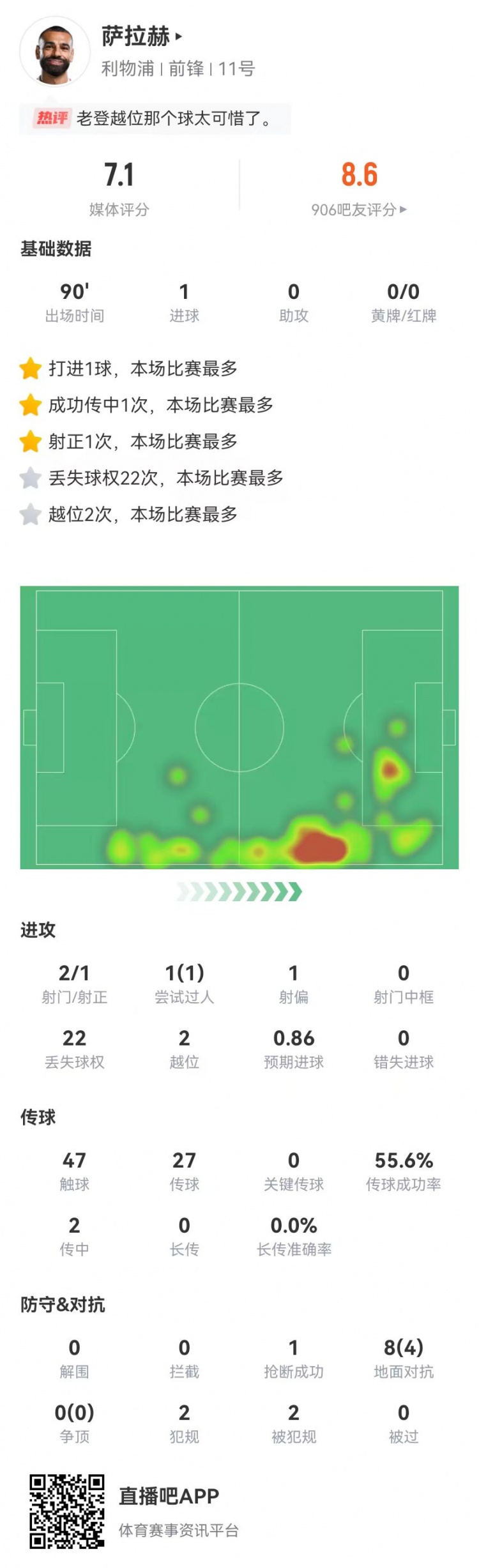 2月17日訊 利物浦在本輪英超2-1險勝狼隊,薩拉赫本場數(shù)據(jù)如下: